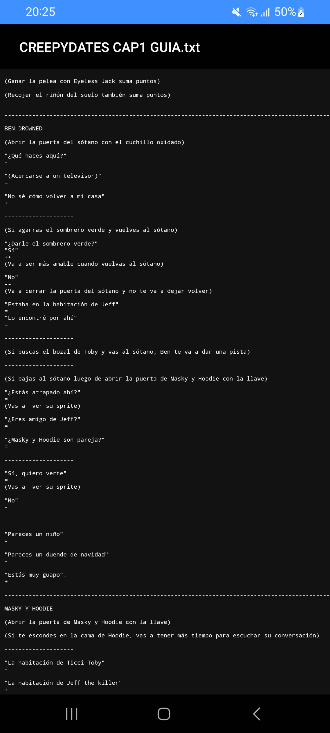 ¡Genial juego! ¡Me encanta! Pero falta mucho texto. Por ejemplo, cuando (tu personaje favorito) y Toby hablan en el capítulo 2 en su habitación, se ven sus bocadillos, pero no hay texto. No entiendo por qué, ya que ocurre en todo el capítulo 2 y no en el 1. En general, ¡el capítulo es genial! ¡Sigue así!