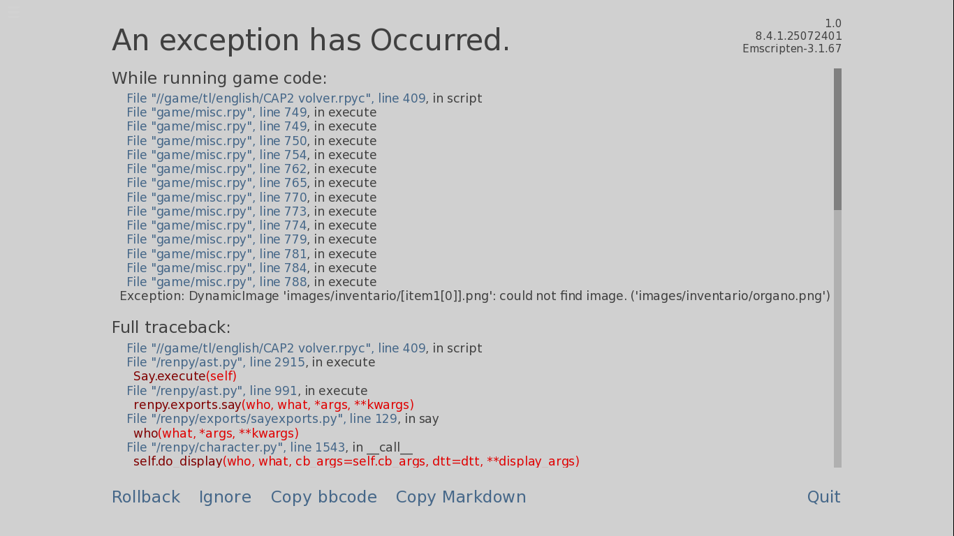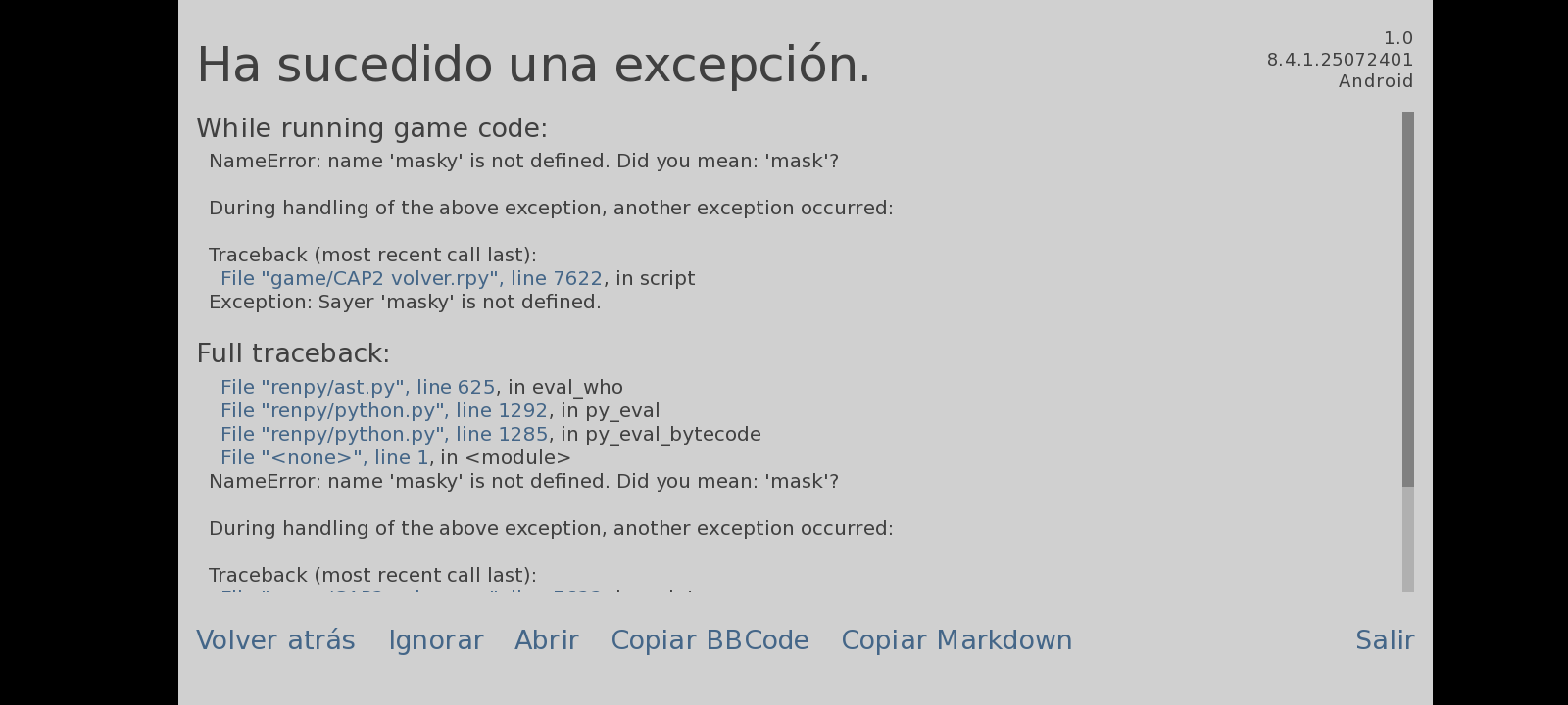 I ALREADY FINISHED CHAPTER 2, and I must say WOAAAAA, GOD, IT'S BEAUTIFUL!!, I only had this error when I did the route where we chose who to do the mission with and in my case I chose to go with Masky and Hoodie, and when I left attack the tower, when the dialogue started, I couldn't continue because of this error, but then I could continue playing normally! It's not a complaint or anything, it's just so you take it into account, PLEASE ALREADY RELEASE THE CAP 3 😭💗